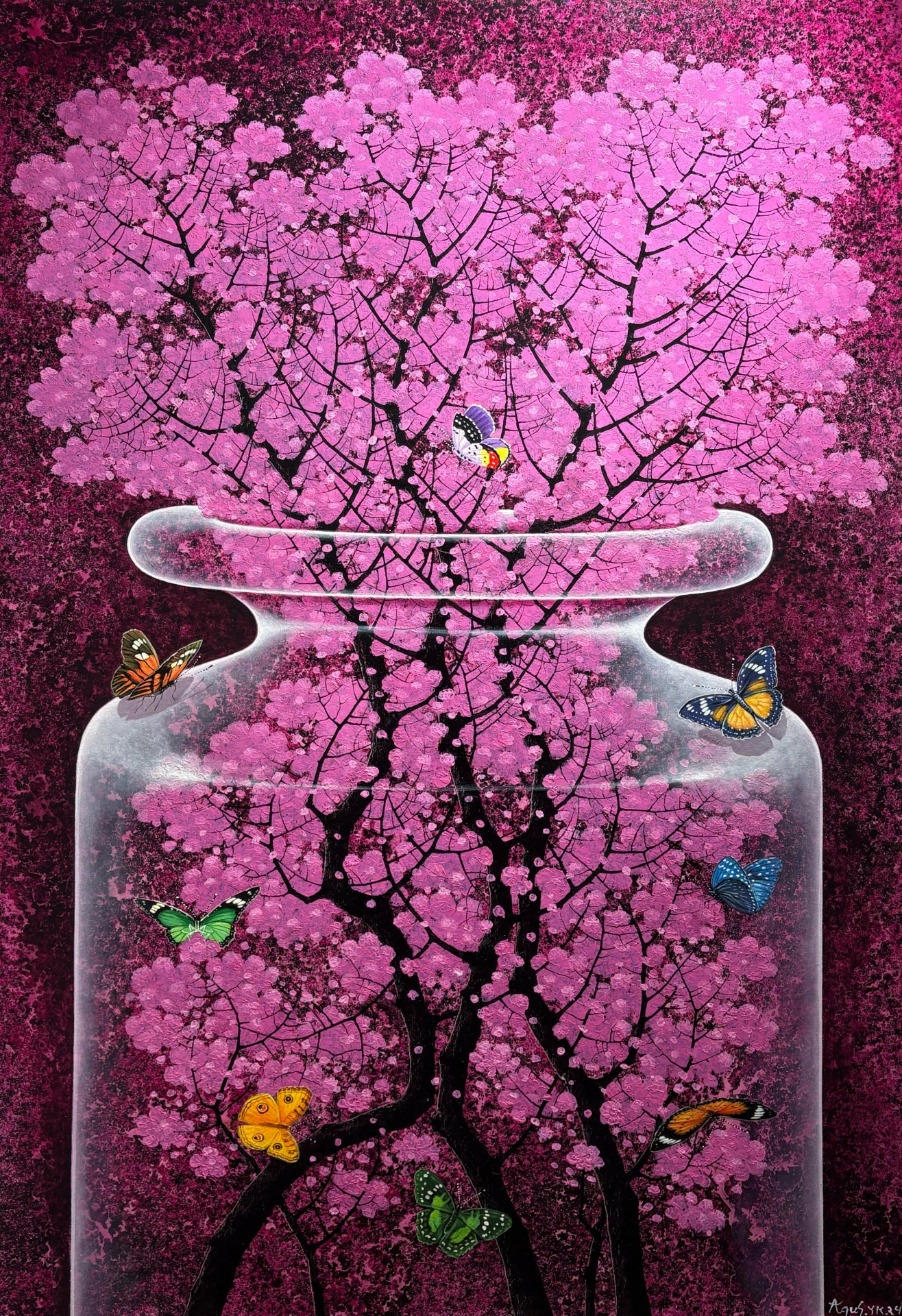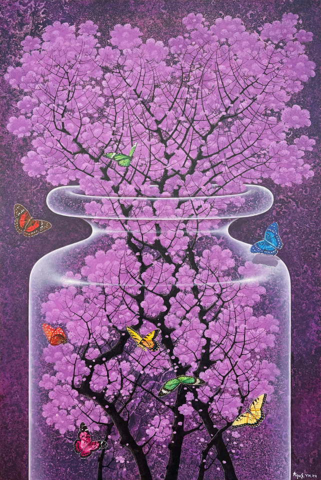 Nature is his greatest source of inspiration. Fascinated with the universe, the magnificence of sakura (cherry blossoms), and natural phenomena such as volcanoes & earthquakes he has personally experienced, Agus often places these subjects in his works. "I'm a big fan of sakura because of its philosophical value. The sakura is as exotic in the fall as it is in the spring. Its beauty is never-ending" he said.