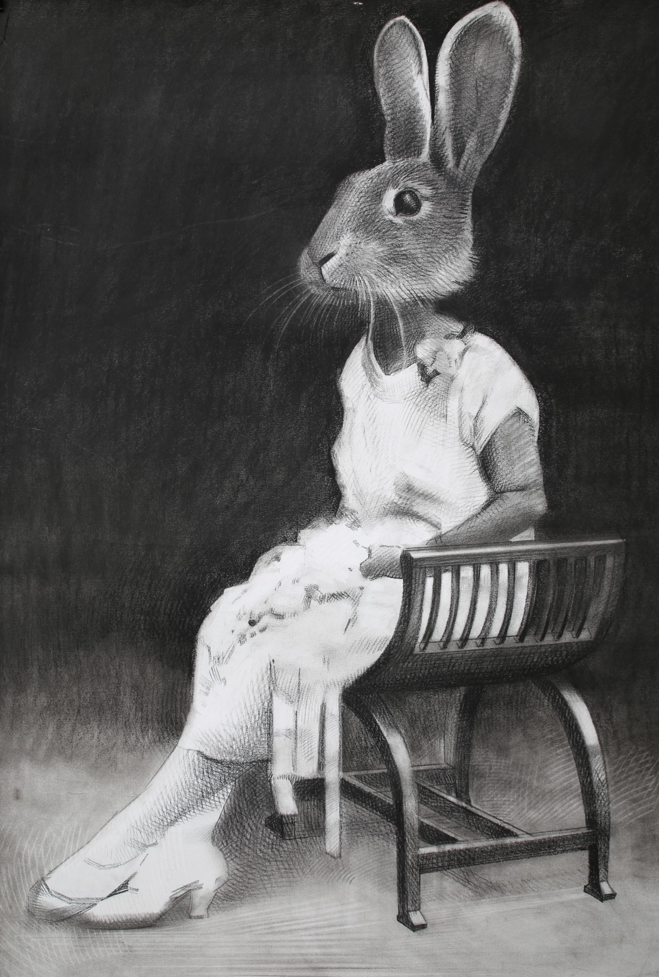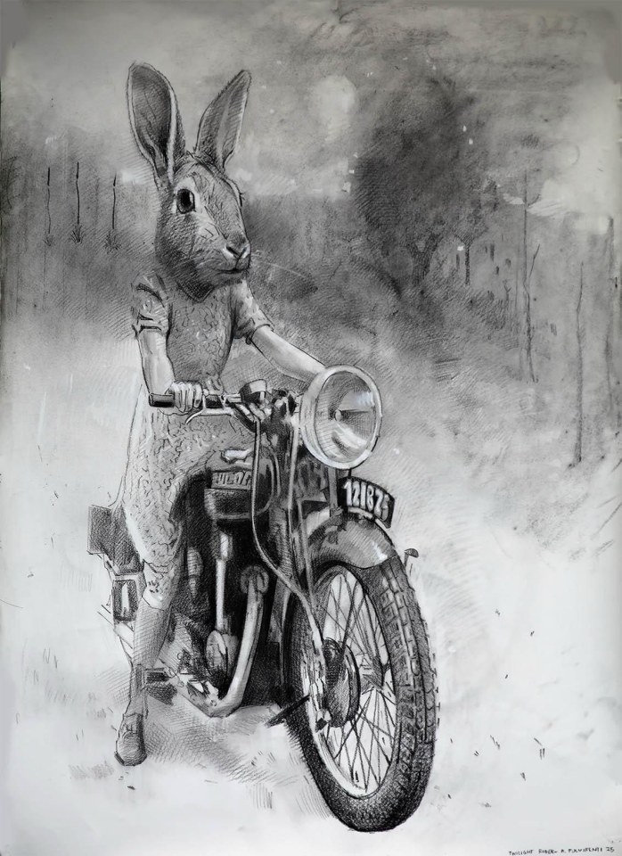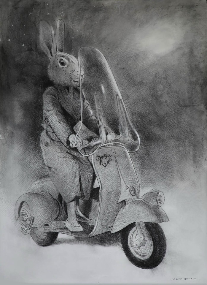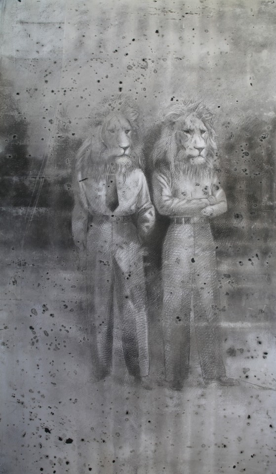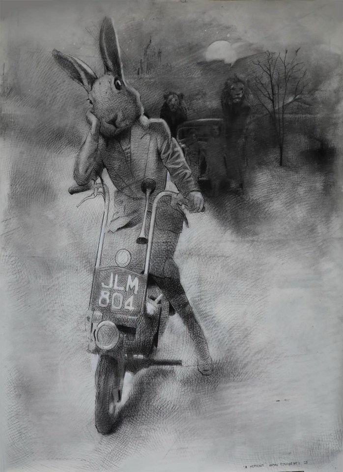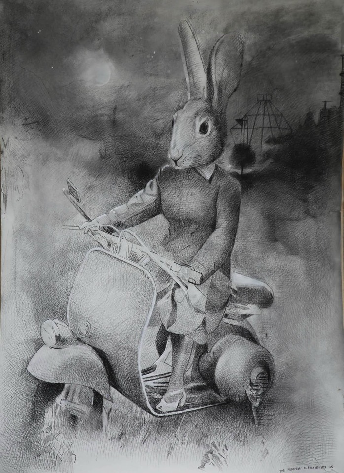 These drawings explore the memory of my grandfather’s internment in World War Two and its intergenerational transmission to the present day. I have used human and animal forms in the landscape to depict psychological undercurrents of the Italian internment experience. The rabbit is an introduced species that the Australian government has periodically tried to control unsuccessfully which has become a metaphor for the Italian Australian experience of internment in my work. The placement of the rabbit’s head on the human body is telling, as it suggests a being led by animal desires. Indeed, the experience of detention occupies an existence between the animal and human: one governed by the absence of normal law in which one is not fully human. It is as if by drawing one can lay past experiences to rest, or at least lessen their destructive potential in the present.