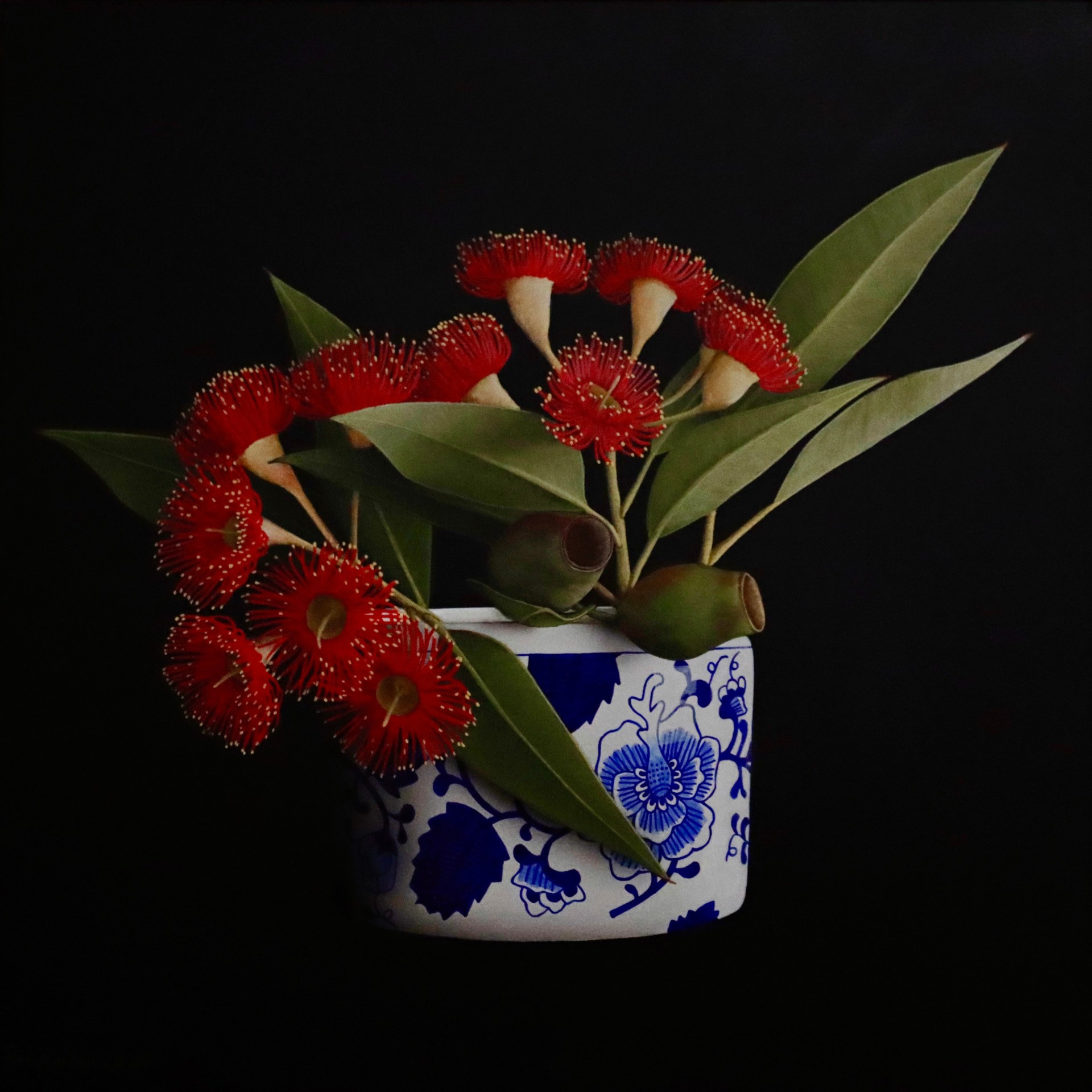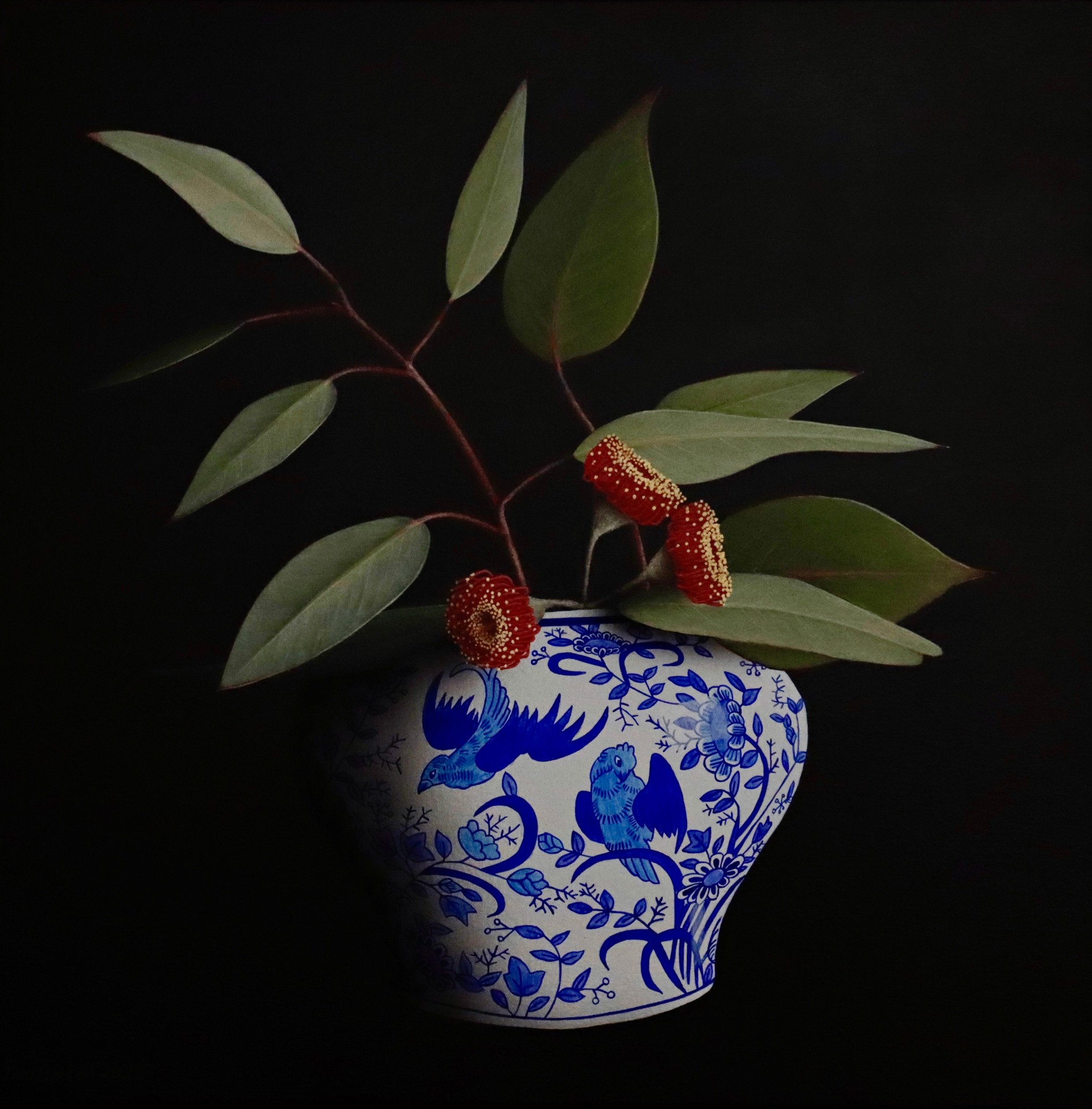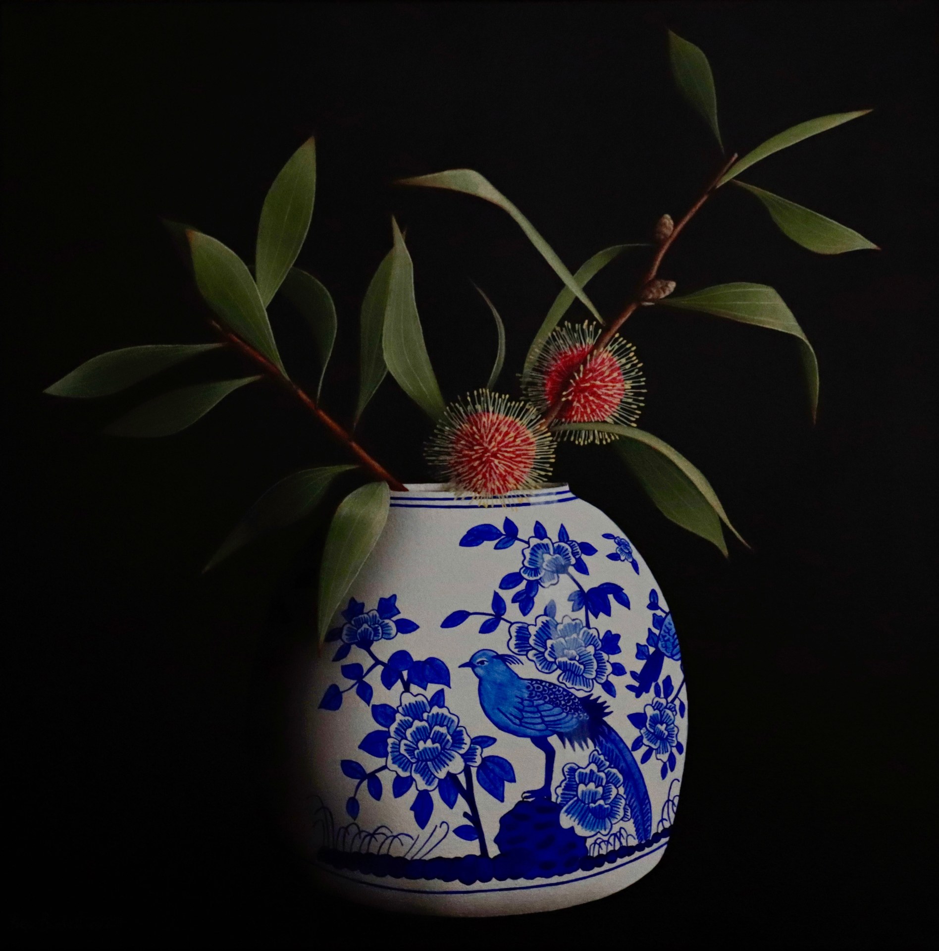 “I explore the stark contrast between the elements of dark and light and capture the beauty in both. The variation of the soft delicate bird feathers against hard ceramic, the melody of colour in the native flora constrained by the bold artificial blues of the vessels that contain them, highlight the harmony of the natural beauty suppressed in the modern world.“