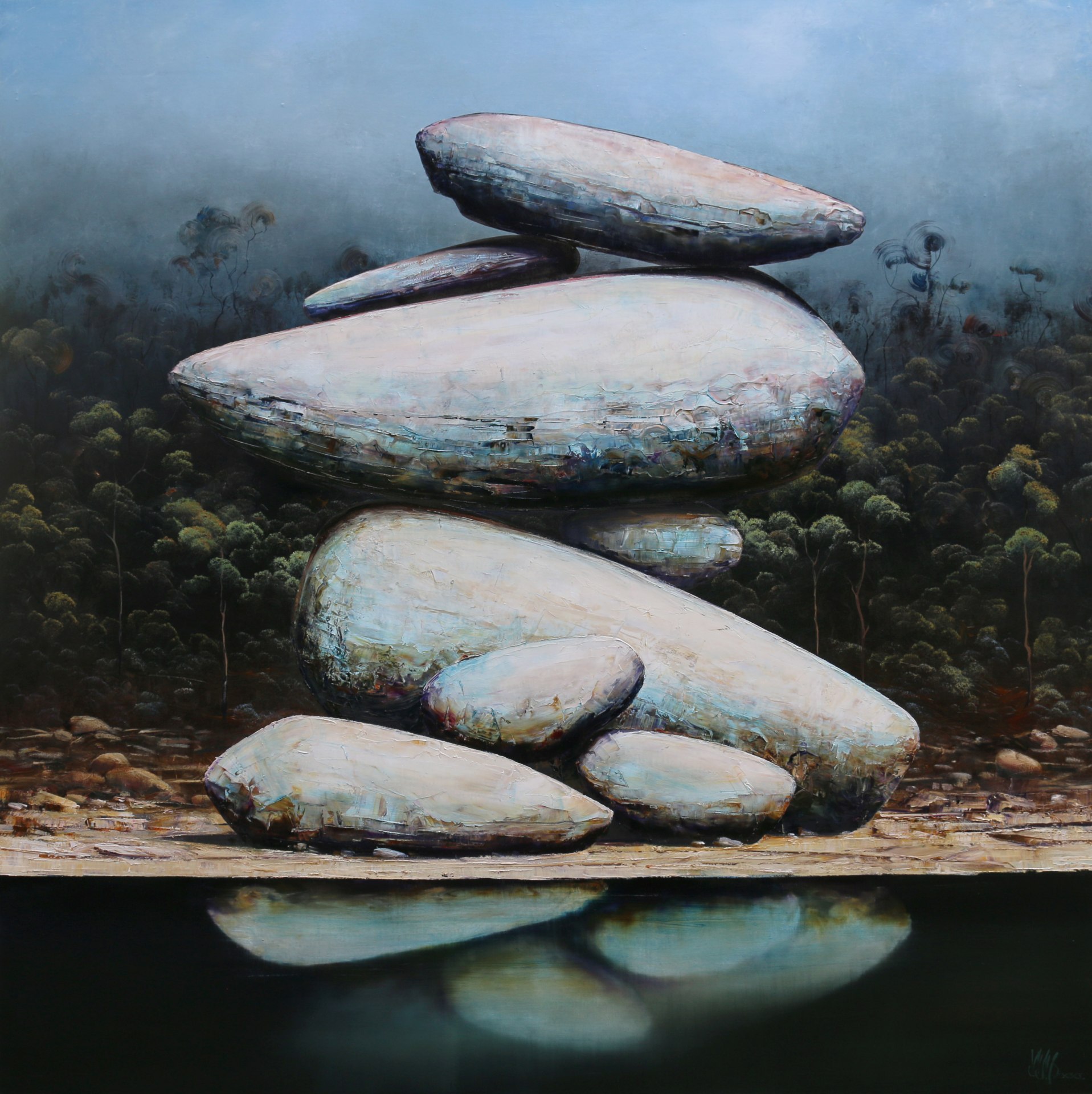 Lees’s process is straightforward. He begins with a sketch which organizes the painting, creating a sense of balance and proportion that is transposed onto the canvas, working to achieve a composition that is harmonious. The resultant landscapes are still, stark, and mysterious. Devoid of people and fauna, they echo the experience of the painter in the studio with only his creative muse for company.
