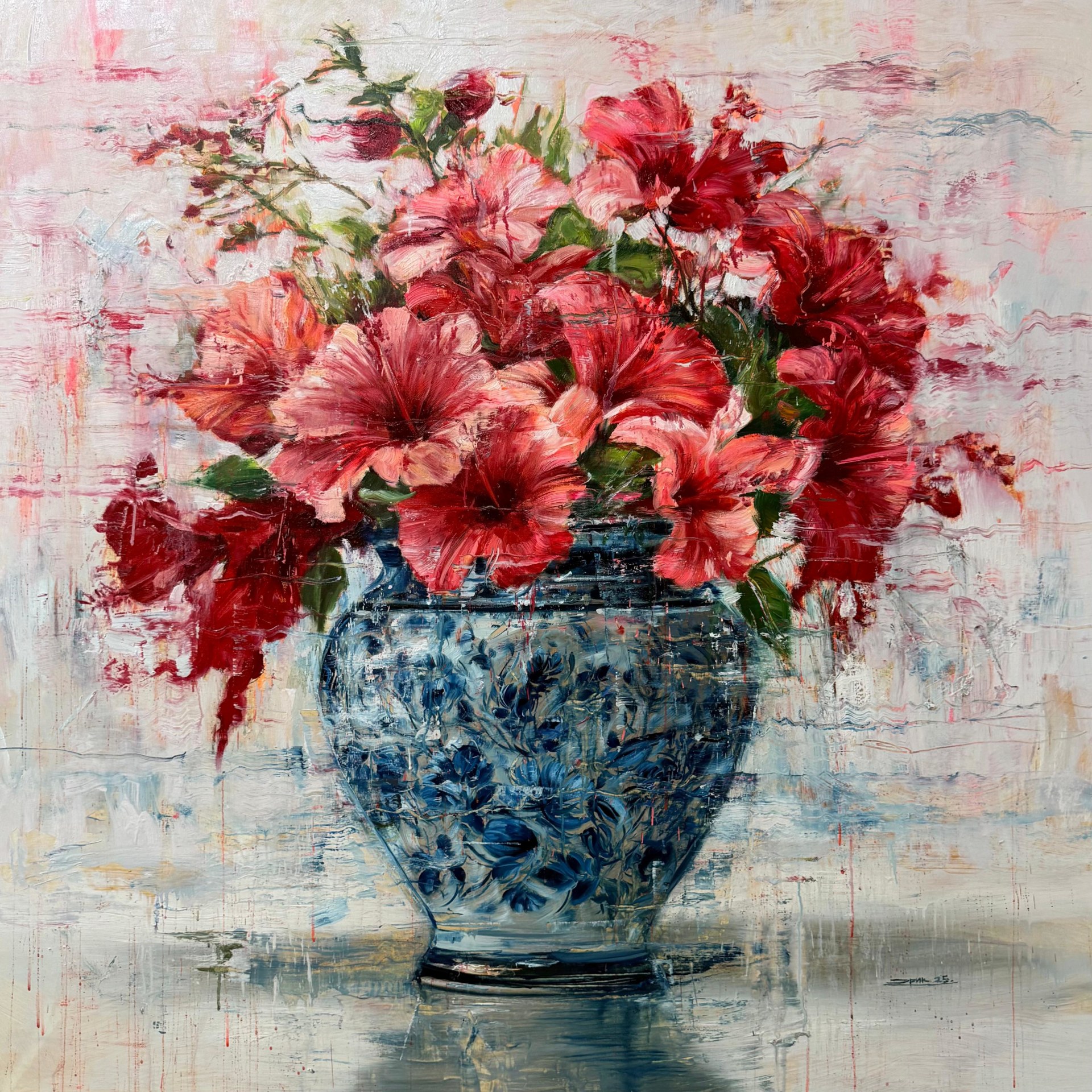 Alfaro’s characteristic style showcases visible brushstrokes, minimal blending of paint, and his ability to capture movement within his subjects. By smudging fresh paint horizontally across the canvas, Alfaro creates the impression of time passing before the viewer’s eyes, adding a sense of transience to his work. Alfaro continues to push the boundaries of his artistic practice, evolving and exploring new mediums and techniques, in recent years Alfaro has taken his work towards public art, developing several large murals in the city of Miami, USA.