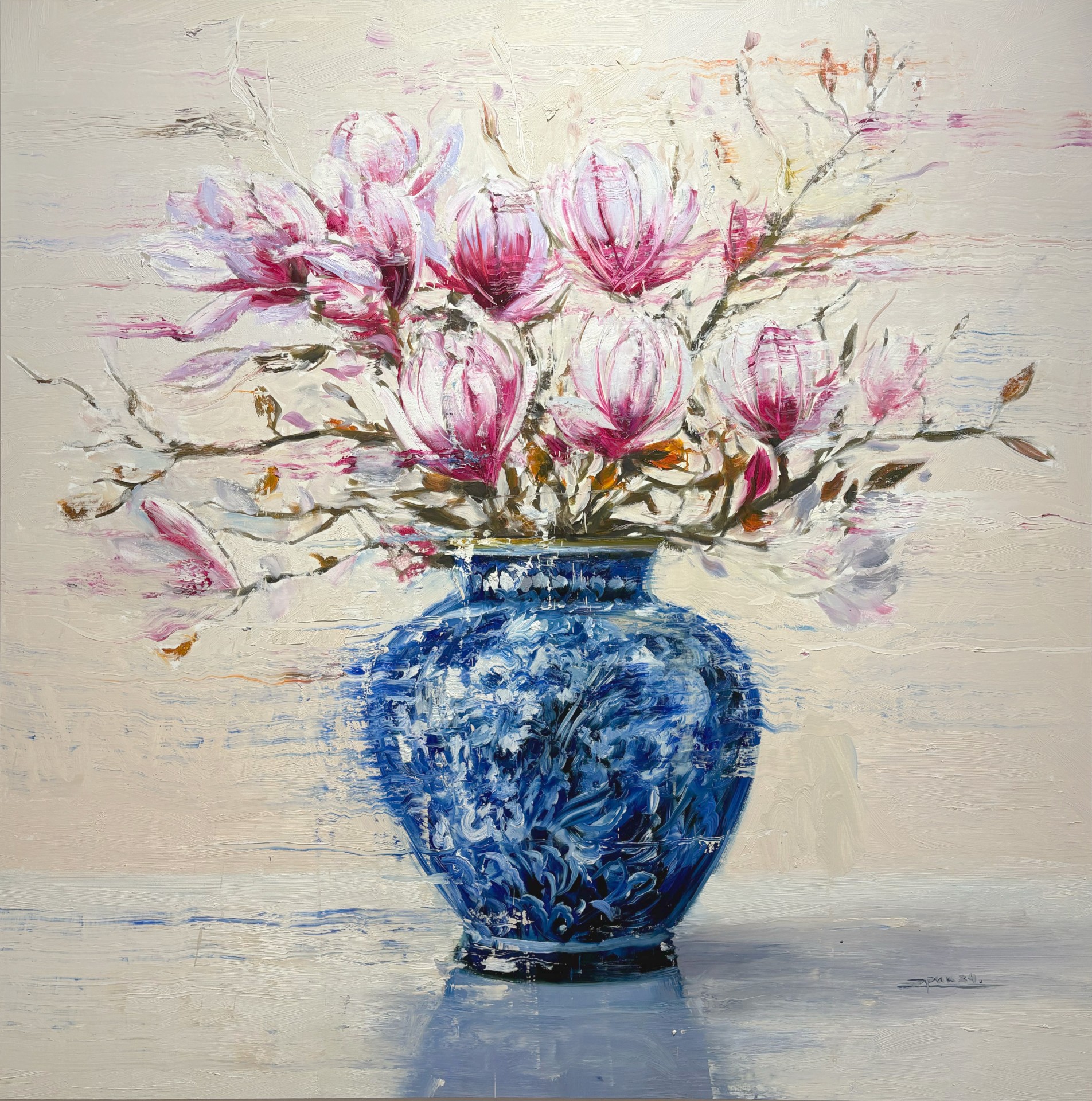 Alfaro states ‘Flowers have always been present in my work in one way or another, along with a certain influence from Asian iconography and art’. He is particularly drawn to the beauty of Japanese cherry blossoms ‘I found the cherry blossom in particular very poetic and interesting because it marks the beginning of spring and has a very ephemeral rebirth each year, since it is a very short-lived flower, it reminds us how momentary life can be’.