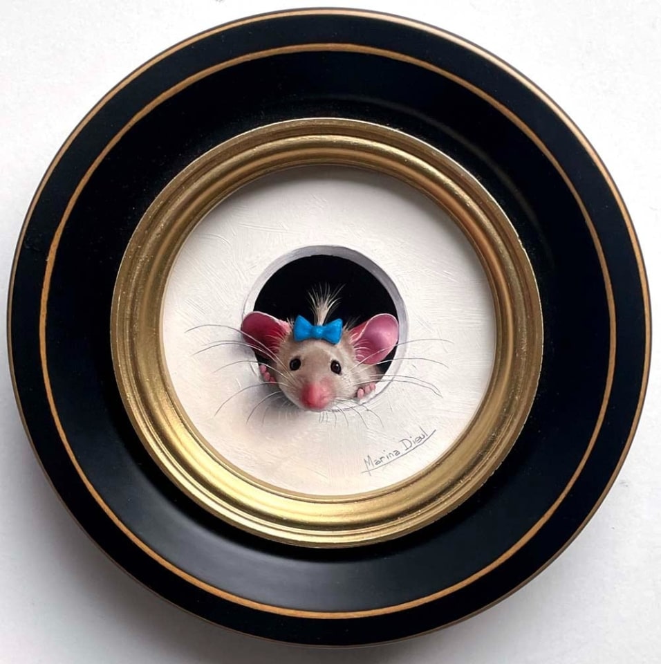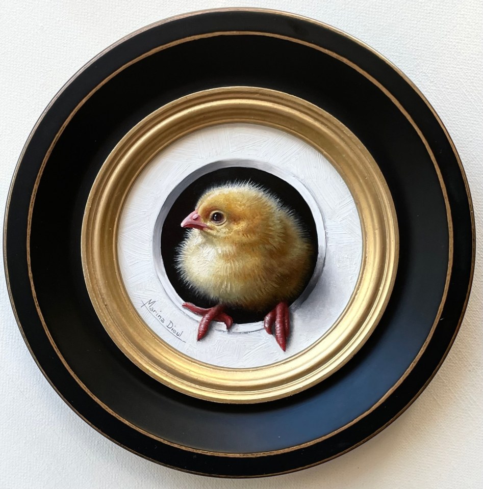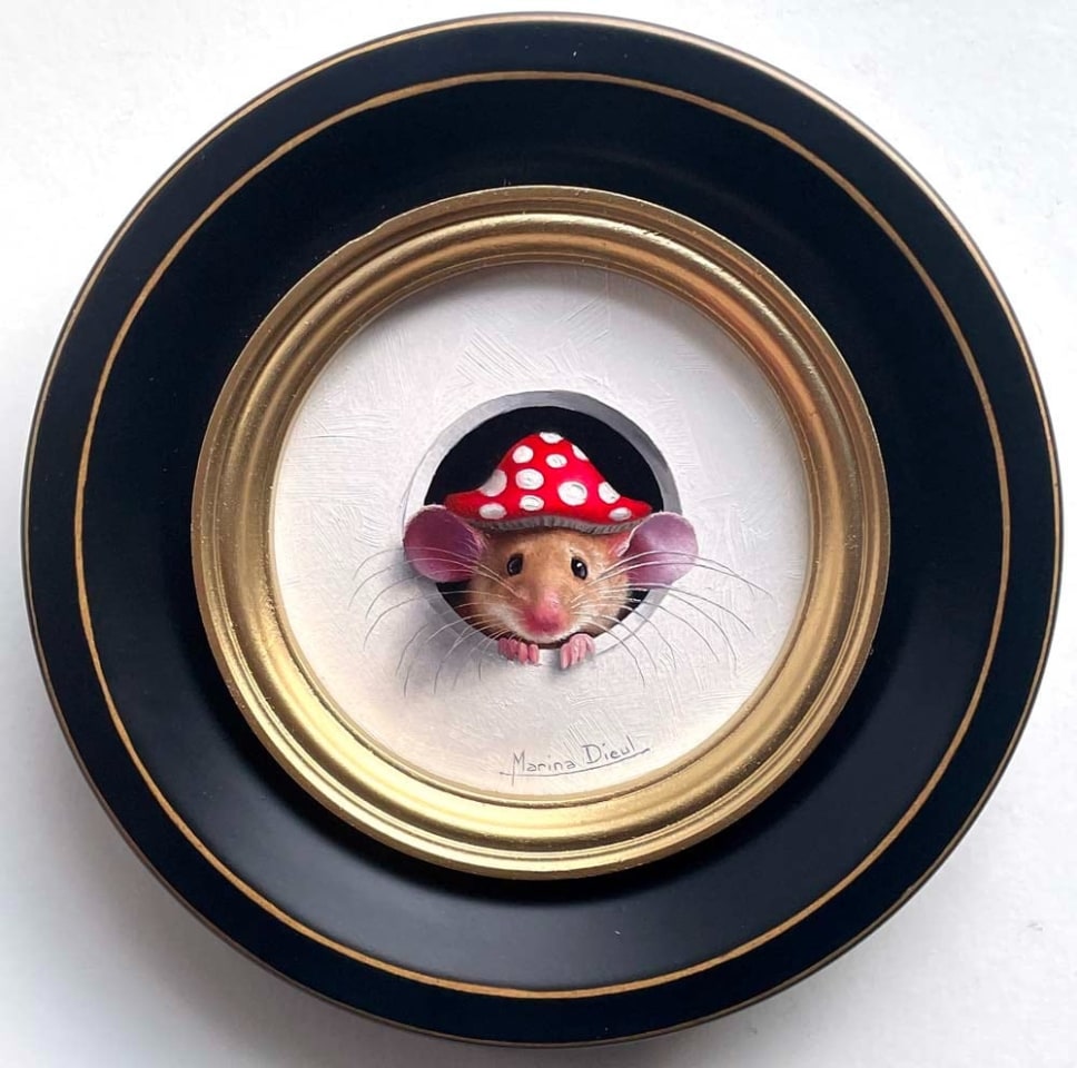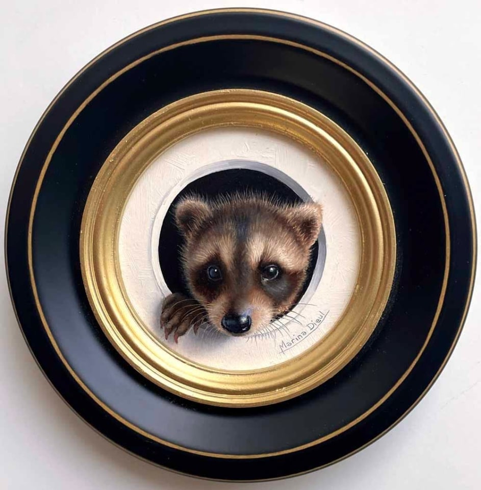 Marina Dieul is known for her animals and figures paintings in trompe-l'oeil style, full of humour and poetry. She works in her Montreal studio surrounded by the many cats she fosters for a no-kill shelter in Montreal.