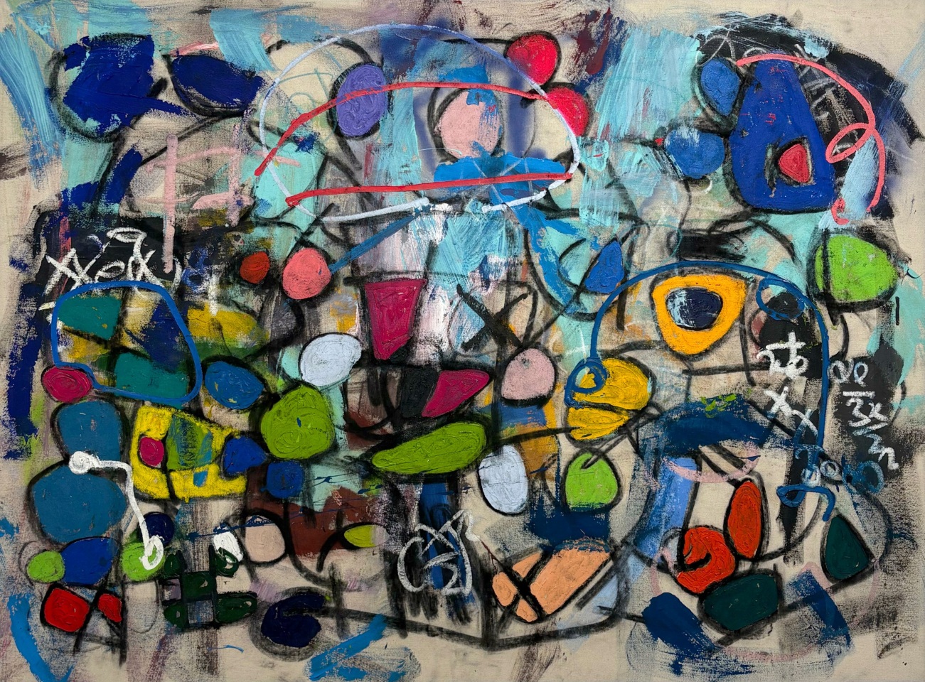 Through a series of spontaneous movements, directly inspired by the way canvas responds to layers of paint and gestures applied to it, Jaoui compares his work to a dance routine with a familiar partner. And while impulsive and unconstrained in its core, the familiarity with materials is essential for the creative process that strongly depends on the ability to respond quickly and foresee the way the elements will work together. Layering pastels, oils, and acrylics, the artist accents the richness of his work by constructing a raw texture which directly captures the physical energy put into each piece. Serving as a channel to convey his thoughts, emotions, and visions, the artistic practice is Jaoui's source of confidence and peace, while the finished work becomes a documentation of the process of achieving those feelings.