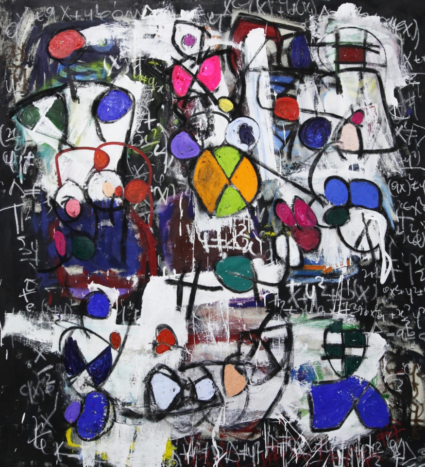 Creating captivating and labor-intensive work with an idea of continuing the legacy of abstract expressionism movement from the 50s and 60s, Taher Jaoui’s paintings are rich assemblages of layered forms, vibrant colors, expressive gestures, and mathematics signs and formulas. Applied on canvas through a dynamic interaction, a physical back and forth dialogue in which perspective and orientation continuously change until all the elements are balanced right, these opulent creations are the artist's personal way of expressing himself.