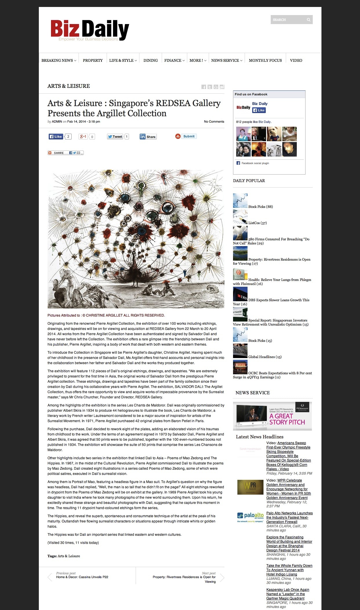 Originating from the renowned Pierre Argillet Collection, the exhibition of over 100 works including etchings, drawings, and tapestries will be on for viewing and acquisition at REDSEA Gallery from 22 March to 20 April 2014. All works from the Pierre Argillet Collection have been authenticated and signed by Salvador Dali and have never before left the Collection. The exhibition offers a rare glimpse into the friendship between Dali and his publisher, Pierre Argillet, inspiring a body of work that dealt with both western and eastern themes.