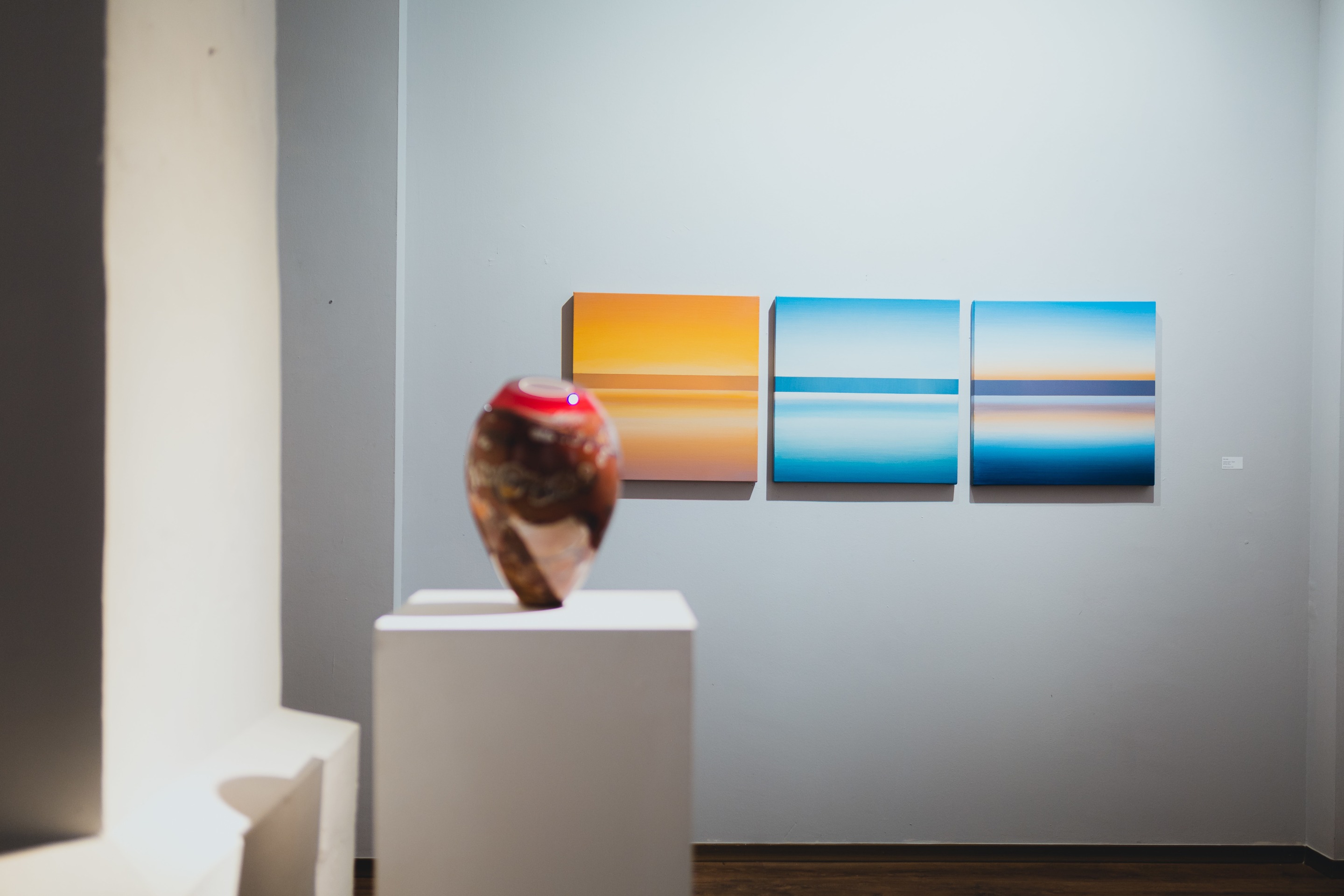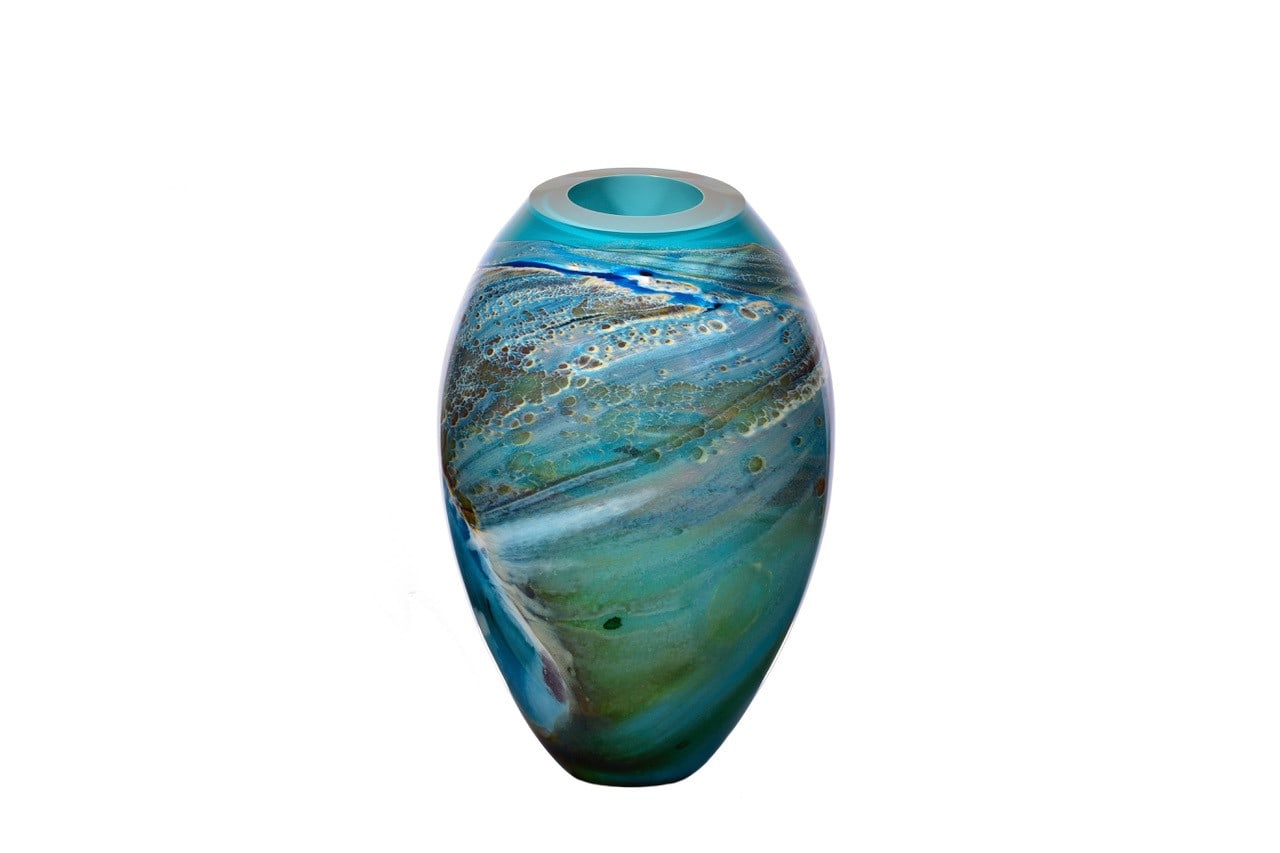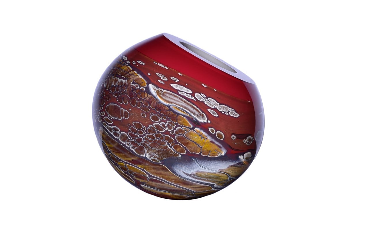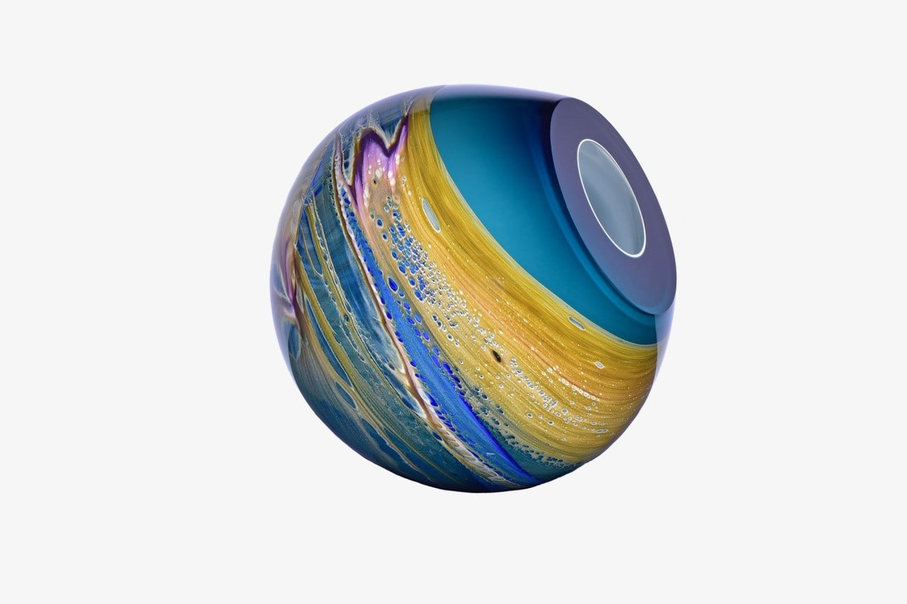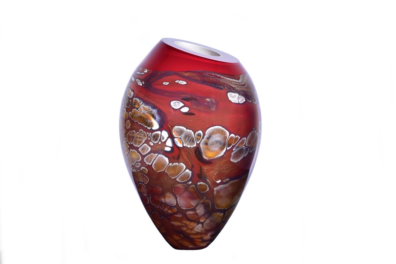 Cook’s canvas takes on the form of glass vessels; a medium he crafts in a molten state by hand at a furnace. Based on a reflection of nature and its environment, a series of glass colours are mixed with a visual in mind. With limited control over how the patterns would result due to the developing technique, Cook does his part to ensure the harmony, form and flow are ideal while shaping and polishing the blown glass. The patterns that are generated in his surfaces incorporate dried watercourses on coastal coral reef structures and Pindan plains, a red-soil country of the south-western Kimberley region of Western Australia. Cook tries to encapsulate the infinite vast panoramas of the Pilbara, both coastal and inland, within the three dimensional forms of his works.
