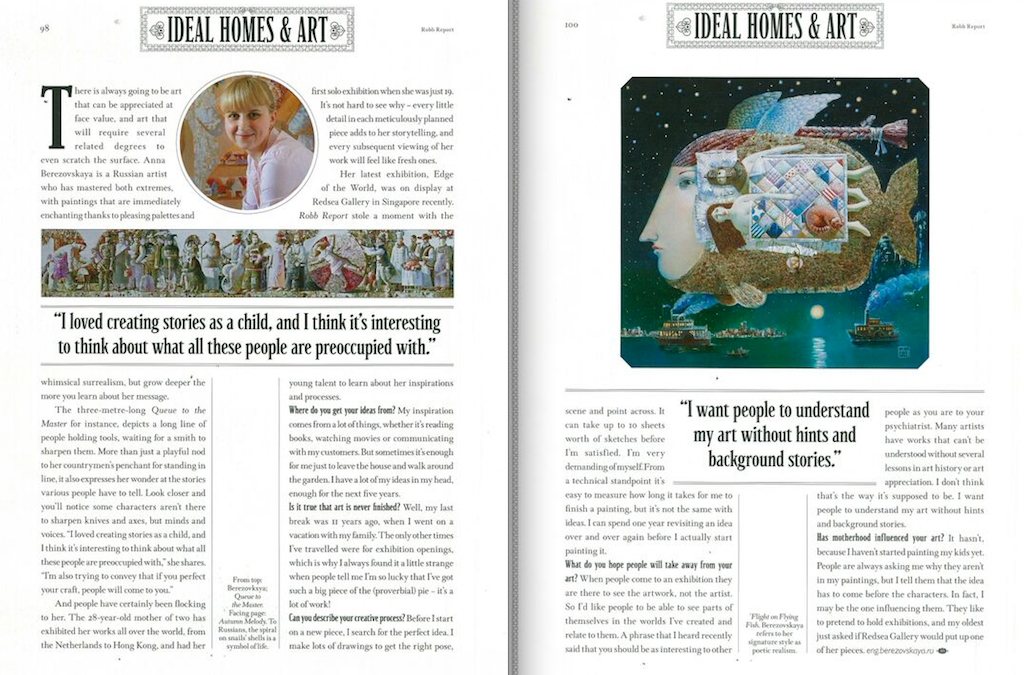 Art is a lot of things: a picture on the wall, a reflection of the artist’s personality, a cherished memory, a collector’s item, and so on. But above all, art is an experience, and this comes through strongly in Russian artist Anna Berezovskaya’s richly narrative artworks, which will be on display at REDSEA Gallery from 12 May to 10 June 2018.